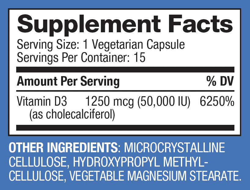 Vitamin D3 50,000 Theraputic Classification: General Medicine Dosage form: Vegetarian Capsules Pack size: 15 Company: WR Group Origin: USA